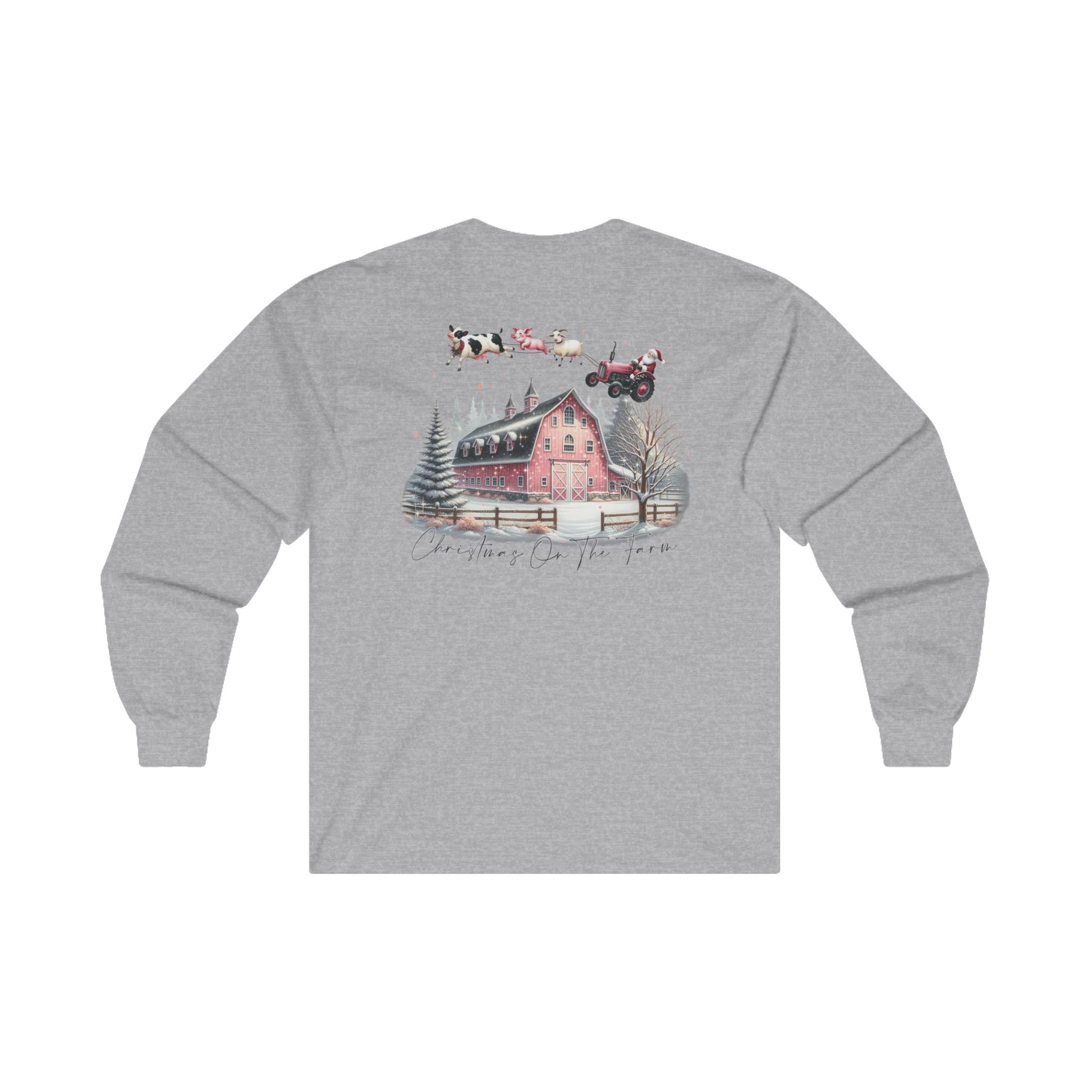 Our Farmer's Christmas Tee features a back design of Santa ditching his sleigh for a tractor- flying high over a snowy barn scene with a loyal team of farm animals powering his ride! Perfect for anyone who wants to showcase Santa's southern charm this Christmas!