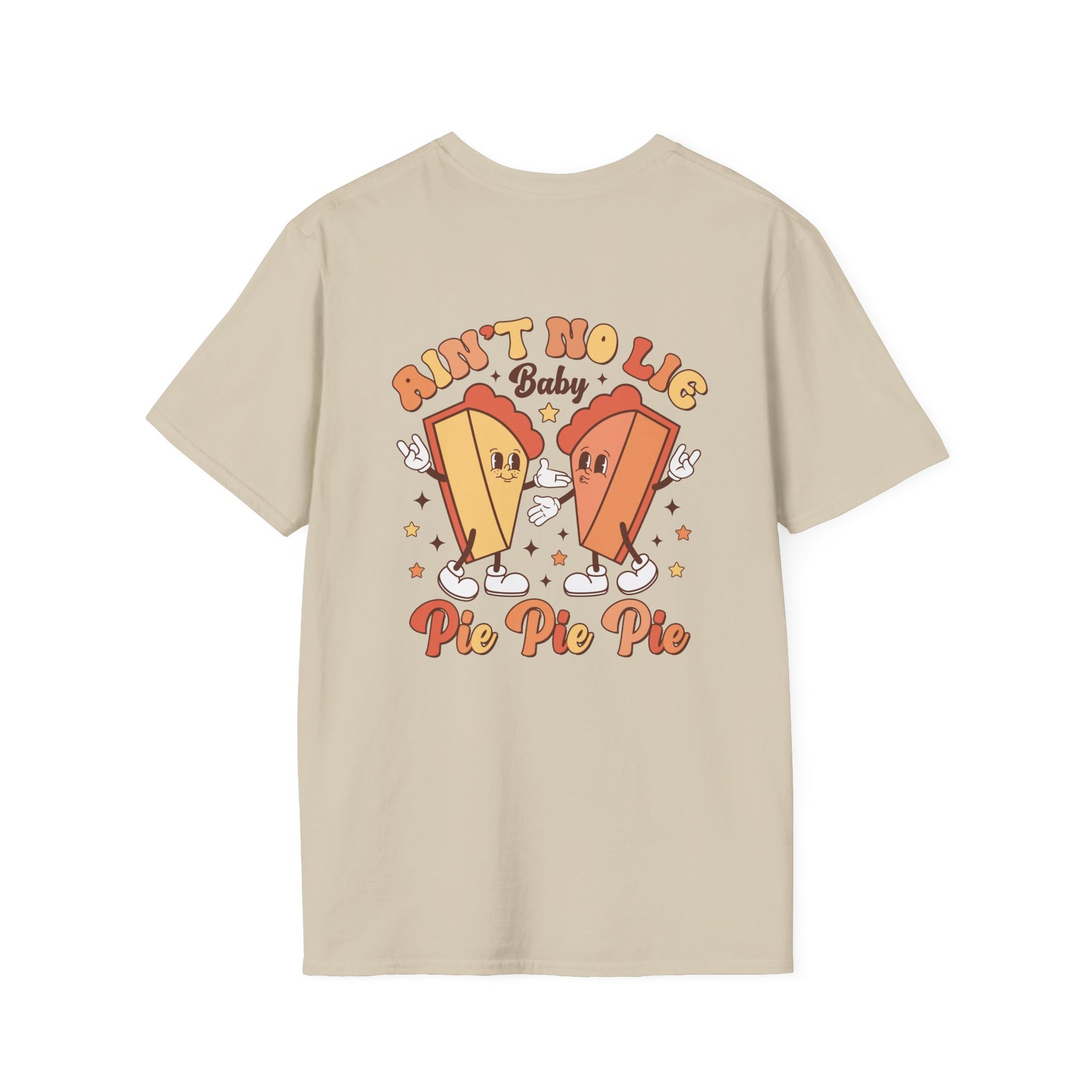 This funny Thanksgiving T-Shirt features two cartoon pies dancing on the front pocket. It also features a back, with the saying 'It ain't no lie Baby, pie pie pie.' Perfect for those who love to add a humorous touch to their holiday wardrobe and celebrate Thanksgiving with a playful vibe.